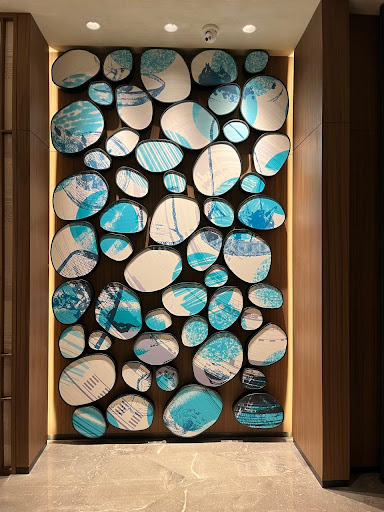 我们从苏州站出发打车约17公里到达酒店用时约20多分钟。酒店一如既往的隐蔽,门头很小,但是比起古运河的英迪格还是要好找很多(不知道为什么苏州英迪格都喜欢藏起来)。门口也有每个英迪格专属的艺术品,虽然我不懂啊。下车礼宾就抢先把车门拉开了,弄得司机有点尴尬。因为我们也没什么行李就没麻烦礼宾了。到了酒店大堂办理入住,前台穿的是青绿色的统一着装不像其他酒店一样是清一色的黑白,我个人觉得非常好看也有一种亲近感。这次入住的是金鸡湖景观的豪华双人床,因为客房还在打扫所以就先在公区转了一圈。整个公区不大,像是一个月牙,但是很有设计感,给人一种安详的感觉,我妈妈是非常喜欢。等了大概十几分钟客房打扫好了,去前台拿房卡时也让我眼前一亮,这家的房卡是圆形的,挺有特色的可以留个纪念。房间在六楼,已经算是高层了,这家英迪格本身不高(想住高层可以去古运河英迪格和湖对面的尼依格罗)。门前的公区空间很大,这就让人很舒服了就算对面是电梯间也因为距离很远听不到什么噪音。入门后的房型很板正,左手淋浴洗手间,右手衣柜行李架,里面就是卧室了。对了,这家酒店除了套房外其他房型全都是不带浴缸一定要注意了,这点我实在想不通英迪格不带浴缸有点离谱了。卧室的设计是以原木,白墙为主体加以深蓝以点缀,浴室则以墨绿瓷砖为装饰。浴室的吹风机也是标配的戴森,浴袍就很有姑苏特色了,一件是墨绿色一件是粉紫色。说实话蓝色和绿色很不好搭配,但是这家英迪格设计的就让人很舒服,从员工的服饰颜色就能看出一点姑苏特色了。迷你吧的饮品第一轮也是免费的,但是除了可乐和雪碧其他的基本也不好喝,咖啡机,胶囊咖啡,茶叶也是标配。打开窗帘就是金鸡湖和摩天轮,虽然楼层不高但是景色还是可以的。床头也是有jbl的蓝牙音箱,就是不能移动。