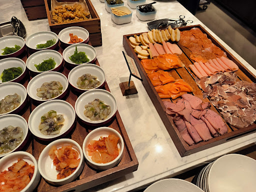早餐单买是188一份成人,不便宜了。早餐厅在一楼,就是大堂隔壁。早餐厅的风格也是以墨绿色为主,尤其是侧面的门全绿。餐品基本上中西都有。中餐有牛肉,大肠,炒饭,炒面之类的,西餐就是肉肠,冷肉拼盘,面包之类。菜品还是比较齐全的就是没有什么特色,每天餐厅还有每一道的特色餐品,我们第一天是水晶虾饺,第二天好像是一个慕斯甜品。如果你要点外卖也是可以的,酒店也有机器人直接送到房间的。