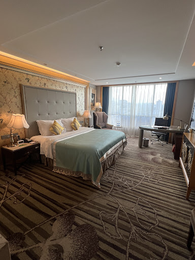 My room was spacious and tastefully styled in a traditional, slightly ornate Chinese décor — gold accents, a floral headboard, embroidered bedding, and patterned carpets. I found it cosy and refined, though a touch old-fashioned. The room included a kettle, a large wardrobe, and an empty minibar (which was fine to store personal items), but no capsule coffee machine — surprising for a hotel of this category.
