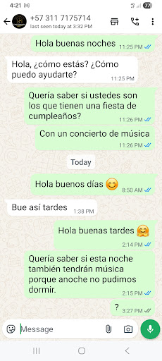 Read moreSi buscan un lugar tranquilo, en paz aquí NO es. El 30 de agosto celebraron el cumpleaños de alguien llamado Maira, tuvieron grupo en vivo hasta casi las 2 de la mañana y después música a todo volumen quien sabe hasta que horas. Nunca recibí una disculpa, nisiquiera...