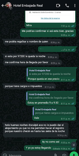 Cuando finalmente llegamos, nos informaron que no podían alojarnos porque ya había pasado la hora de check-in. Para nuestra sorpresa, la recepcionista aseguró haberme notificado esto a las 7:00 p.m., pero el mensaje me llegó recién a las 9:00 p.m., cuando ya estábamos llegando al hotel; Además, el valor de la habitación era diferente al que aparecía en la reserva, pues nos subieron el precio por cargos e impuestos que no estaba.