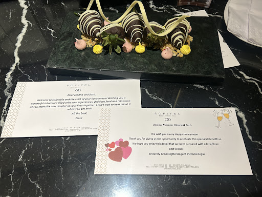 The Sofitel Bogota Victoria Regia was one of the most beautiful hotels! Not only is the hotel beautiful, clean, and well kept, the staff is incredibly friendly and helpful. From the moment we landed in Bogota, the hotel staff went out of their way to ensure we were comfortable. Prior to arrival, we had set up car service through the hotel to pick us up at the airport. Our flight was delayed but I was able to message the hotel staff on WhatsApp to communicate about our timing and get our drivers information. This made us feel so comfortable knowing that even though it was late at night, we were secure. Check in went quick and easy, we checked in at 24:00 but the staff made sure we were comfortable. We did need to change rooms because the noise on the street was too loud for us but the staff made it quick and easy and we were much more comfortable. We were here for our honeymoon and in the room, they set up for us chocolate covered strawberries and some beautiful notes welcoming us! Each night, they also provide Coca tea that helps with the altitude and it was perfect! We loved the breakfast buffet and the amazing coffee! The food was delicious. We also went to the restaurant for dinner and our waiter and bartender were so nice and everything was delicious! The concierge was the most helpful and nice man! He knew us by name and helped us get car service to and from every place e we were going. We were even provided with umbrellas on a rainy day! The hotel is in a great location, very close to all the main areas. The space is beautiful and clean! We highly recommend
