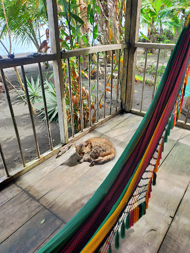Super quiet place! The whole place is amazing and simple, the room right on the beach front sea. A bit scary in the night with high tide but earplugs can solve everything! Even though the nature sound is amazing! Everything quiet clean, they take care of the area around. Little bar where you can enjoy a beer and some snacks. They have a kitchen you can also use but for the gas you have to pay an extra. Breakfast is included and good, coffee and tea available all the long. Possibility to have lunch and dinner, delicious the ceviche!! People here are amazing, friendly, it's another world! One side you have the beach and behind the jungle! They also organize walking tour, just ask! I mostly chill and enjoy my time there! The sea water is warm, the sun strong and when it rains, it does a lot! 15min from thermales, little village with some little shops, bars and restaurants. Also thermal bath! The only thing, is that when there is the high tide, you risk to get stuck because the level of the two rivers you have to cross, goes quiet high. The boats bringing you here leave you right in the front! There is electricity on the coast only in certain times of the day and so it is...