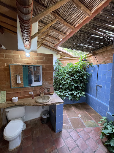 Located almost a 10 minute walk up the hill away from the main plaza, the open setup is filled with gardens and trees and is quite beautiful. The small spa pool is great to cool off in and the room is comfortable and nicely decorated and the staff are incredibly friendly. Loved our outdoor shower.||Oddly the doors on the rooms don't lock or even have proper closing mechanisms, so if another guest wants to go through your things while you're out, there's nothing stopping them. This can be a bit concerning.||Breakfast is good - a spread of eggs, juice, coffee or chocolate, jam, arepa and not the best quality white bread.||Anyone that requires even half decent wifi may want to book elsewhere as the network strength here quite appalling. Constant drop-outs and as soon as it starts to rain, there's no service at all. The hotel ought to pay for a better plan or simply not have wifi at all.||The only other issue is the communal lounge located upstairs at the top of the property. Whilst it's a beautiful spot with an open design that overlooks the town, guests use it until very late - yelling, playing loud music which can all be heard in the rooms just metres away. ||Management needs to address this and perhaps put a curfew on its usage so that other guests can sleep in peace. Being kept awake until midnight on one night and then 1.30am on another...