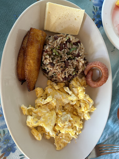 In the Morning we went down for a beautiful breakfast with Gallo pinto, eggs, salchica and fruit. Coffee was amazing too. My wife saw some parrots đŠ as well when we first got up in the tree outside the room which made it even better. There is a playground for my daughter just a quick walk away and a little shop for snacks too