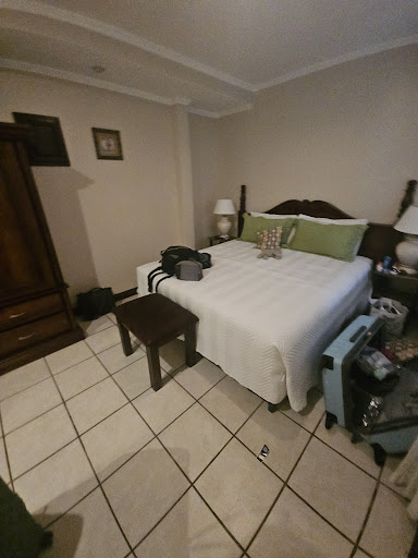 If you need to stay in the area of Orotina, the Hotel Iguana Verde is truly the oasis in the urban desert surrounding it. Its small number of inward-facing rooms all overlook a compact, enclosed terrace with mature, verdant plants around a very attractive pool with a swim-up bar, a feature-waterfall and half-a-dozen sun-loungers. Breakfast by this pool is an omelette and beans (no choice!). Lunch and dinner were once available too, but not at present (Feb 23). However, pizza and seafood deliveries (and probably burgers and chicken too, but we didn't ask) can be ordered easily from the front desk for consumption 20-30 minutes later in the air-conditioned dining room or by the pool using FOC the hotel's cutlery, crockery and glasses. Our room had a double and a single bed - but maybe not all the rooms have this. The hotel has a high-fenced and fully-gated parking compound immediately alongside, which is reassuring even (and I have no idea at all) if the security is unnecessary. Hose owns the hotel and is a hands-on Manager. He is very ably assisted by the outstandingly excellent, thoughtful and considerate Andreina. We would happily return to the Hotel Iguana Verde if we had a reason to want to stay once again...
