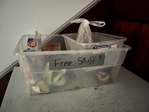 The kitchen buzzed with travelers' delight, Labeled shelves and pens to keep it right. A "Free Stuff" box, a communal treasure chest, Though some old morsels could be laid to rest.