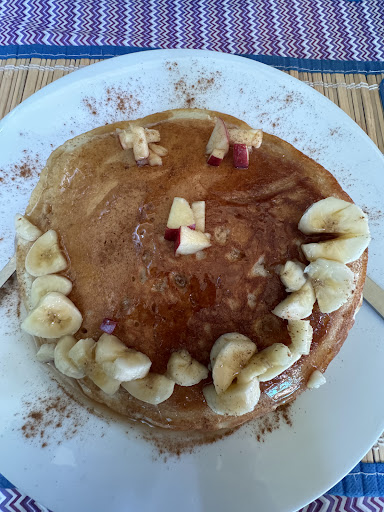 Morning brought a pancake, smiling bright, Apples and bananas, a whimsical sight. Coffee flowed as freely as the breeze, A carb-filled start; perhaps some eggs, please?