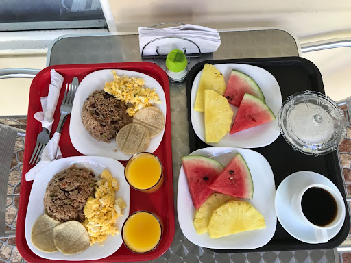 The breakfast is simple but delicious. Some mornings are eggs/meat, fruit, toast or pancakes, other days there are eggs (no meat), rice & beans, toast, and fruit. Always juice, coffee, and tea as an option.