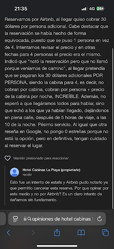 Mencionar también que en el momento de la reservación por medio de la aplicación cometimos un error que fue colocar que la reservación era para una persona. Cuando éramos 5. Contactamos con el “anfitrión” y se le expuso que éramos 5 personas, ya que las cabañas están puestas para 4 (al final la aplicación cobraba igual por 1 o 4 personas. Lo que tuvimos por respuesta fue que no había problema que nos cobraba $30 dólares por esa persona extra ÚNICAMENTE.