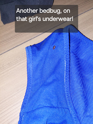 Before going to bed, I looked up and saw a bug crawling on the top mattress. Since I had already taken off my glasses, I thought it was just attracted to the light. In the morning, it turned out to be a bedbug! The girl who was sleeping on the top bunk found another one under her pillow! She immediately started checking her things that were hanging on the bed and found another one right inside her underwear! When another girl squashed the bug, we saw blood, which meant it had already bitten someone! The two girls were scared and decided to leave immediately.