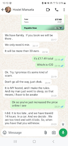 Hostel itself is fine - room, kitchen and bathrooms clean. However, I arrived late one evening (due to flight delays). On arrival I whatsapped the owners who told me that the rate was €30 despite it being around €20 on hostel world. They told me that "hostel world" was a scam and to not book it through it. I tried anyway, and whilst doing so, the owners changed the price to over €30. I felt that was unfair, and she stated that she didn't care as it was late, has four children, were tired, and that it's their hostel, and they make the rules. She made assumptions about me and my life stating that "if I had 4 children, I'd understand." Totally unprofessional and unfriendly and rude. I had no other options and so had to pay them €30. She had no sympathy that I'd also been travelling all day and simply wanted to make as much money out of me as possible, given my late arrival. Unpleasant experience, and I would not recommend this place...