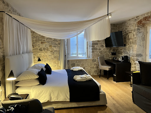 Read moreThis place is special. It is within the Diocletian Palace. It is so within the palace that two of the walls of our room were the original Palace walls. The room was stunning and the history of it makes it so cool and for a great story when you get home.||Our room was very large and perfectly appointed. We had a view of the small square just outside the hotel. The staff was as friendly as can be. The hotel can only be reached by foot so they came to meet us at our car and assist with the luggage. Due to size limitations the breakfast spread is fairly small but very nice and they do have a menu of hot items made to order.||This is a small boutique property in a perfect location with an amazing history. Absolutely loved it. There are two restaurants right outside the hotel in the square. We ate at one, Portofino which we had reserved before getting there and were pleasantly surprised it was right outside - it was great. Had we stayed one more night, we would have tried the other restaurant which is right outside the door of the hotel because it was always busy and the food looked great.||One thing of note, the lobby can only be accessed by stairs before you can then take an elevator to your room so if stairs are an issue for you please...