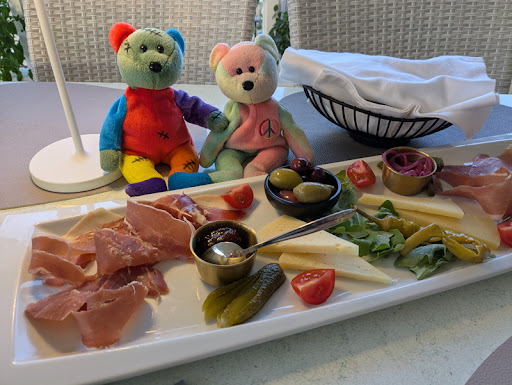 The breakfast buffet included with the room is INCREDIBLE and surely has something for vegetarians as well as meat-eaters. Green salads with tuna, smoked salmon, couscous with veggies, breakfast pastries, eggs, quiche, cheese and cold cuts, yogurt with granola and all the fixings for muesli. Fresh fruits and veggies, coffee, juice, and all kinds of yumminess to get your morning off to a great start. Sitting on the terrace each morning lingering over breakfast and coffee was delightful.