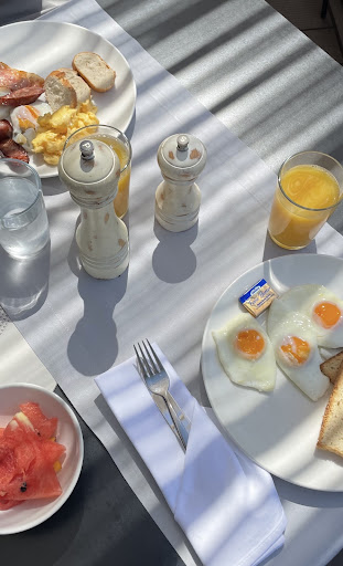 The breakfast was delicious and had everything we could have wanted: various bread/baked goods, cut-up fruit (watermelon, grapes, peach etc), eggs (both fried and scrambled), cheese, fresh pressed orange juice and much more. Could also order iced coffee, hot cocoa and more.