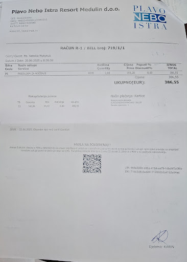 Апартаменти 194в. Ми замовили це помешкання на основі відгуків і фотографій з надією провести гарні два дні на хорватському узбережжі. Але позитивні відгуки, як на мене, фейкові або люди не бачили чогось дійсно хорошого. Все що було гарного- це наповнення кухні, тобто був присутній посуд, холодильник, плита для готування. В приміщенні в цілому були прийнятні умови. АЛЕ.. Трабли почалися ще при замовленні номера. В описі ніде немає інформації про депозит або страхову заставу, як вони її називають, в розмірі 100 євро готівкою. Це з'являється лише, коли ти вже обрав дати і власне починаєш процес резервації помешкання. Оплату за помешкання зняло з картки двома сумами, як вони написали, помилково, що також викликає підозри. В рахунках зазначено назву- Oleander Apt 4+2 St ก Comfort. Але до комфорту там дуже далеко. Наступною проблемою було знайти сам офіс. Нам потрібно було вийти з автомобіля і реально обходити весь квартал. При реєстрації я внесла депозит 100 євроготівкою, крім того підписала підтвердження, що ми заїжджаємо без домашніх тварин, крім того мені всій моїй сім'ї слід було ще заповнити так звані„згоди гостя на збір та обробку даних для конкретної мети„ (додаю Фото) Нарешті ми отримали ключ від номера. Знайшовши наш будинок, що теж було нелегко, так як нормальнв нумерація відсутня (наші апартаменти були на 2 поверсі і номер був лише на вхідних дверях, які не видно з дороги) ми виявили, що наше безкоштовне паркувальне місце зайняте іншим автомобілем. Ми повернулись до офісу і заявили про це адміністрації, нас опросили дати номер того автомобіля, що зайняв парковку (хоча в описі вказано, що є відеоспостереження) та порадили простот слідкувати, коли той автомобіль поїде і тоді перепаркувати своє авто, а поки що, тимчасово припаркуватись десь поряд, де є вільне безкоштовне місце. Тобто нам довелось наші речі носити значно далі до свого номера. Наступним сюрпризом був сам номер. Досить чистий, але кондиціонер був лише у кухні-вітальні і налаштований так, що все холодне повітря дме прямо на диван. Тобто ні сидіти, ні спати там немає можливості. В спальних кімнатах кондиціонери відсутні. За вікном температура +32, спати неможливо. У ванній кімнаті відсутній фен для волосся, шампунь, гель для душу. Є лише мило і туалетний папір. Wi-Fi не працює у спальних кімнатах і ледве працює на одну поділку у вітальні. На численні скарги до адміністрації ми отримали лише поради його перегрузити, спробувати знову і брехню про те, що майстер уже все полагодив. Але найбільшим сюрпризом була гаряча вода, яка закінчилась на другий день нашого перебування. Ще при реєстрації нас попередили, що водонагрівач ні в якому разі не чіпати, бо він налаштований на заданий режим. Ми повернулися з пляжу о 20:30 і виявили, що гаряча вода відсутня, про що я написала адміністрації. Відповідь, звичайно ж отримала зранку о 7:00, коли запрацював офіс. Мене перепитали чи працює водонагрівач, чи світиться лампочка і сказали, що пришлють майстра. Ніхто навіть не вибачився, що ми були без гарячої води півдоби. Майстер виявив, що проблеми ніякої немає, просто вимикач водонагрівача знаходиться зовні в коридорі, поряд з вимикачами світла і витяжки у ванній кімнаті і звичайно ж, коли ми їхали на прогулянку ми все вимкнули. Це ж так просто і легко наклеїти малесенький підпис, що це ,,Water heater,, і ,,Don't turn off,, і гості були б 