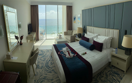 Read moreTHE POSITIVE: The hotel has a lovely atmosphere, nice modern design. The rooms feel modern and high tech. The sea view was amazing!! Rooms were very clean. The staff were really friendly and all really professionals, especially the pool waiters and the pool assistance, all very accommodating. The idea of reserving our bed pools was really good for such a busy hotel, unloading the stress from chasing every morning the right spot. The pool was great and quiet. Loved the fact that there is an in-pool bar, and also that is shallow enough to relax on any corner. The area, the sea view, and the overall atmosphere was relaxing and calm since is adults only. The restaurant food was very nice with plenty of options each night, and the breakfast had everything we expected. We were also offered to stay after our check-out and use the spa showers, and that was very accommodating and nice of them.