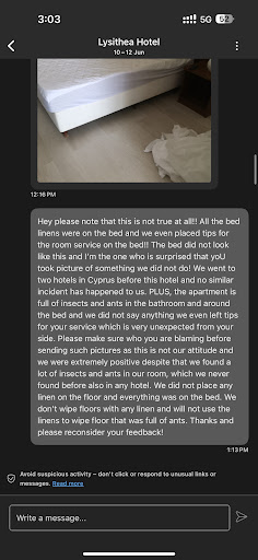 Read morePLEASE Avoid this place. It ruined part of our trip, and no guest should ever be treated this way. They are extremely rude and have never seen such an attitude before. First time to write a review but I’ll post screenshots to show how unprofessional they are!|1. We were falsely accused of using the bed linens to clean the floor, something we absolutely didn’t do. When we clearly said we didn’t do that, the manager didn’t believe us at all. We checked in late around 10 PM, left the room by 10 AM the next morning (or even earlier), and we left everything clean and untouched. Still, she acted like we were lying and kept pushing the story that the maid found the room in a bad condition. Instead of listening to what we said, she basically decided we were guilty without any proof. Why would I clean the floor with the linens that we will sleep and use in the same night? NOTING THAT WE LEFT MONEY ON THE BED FOR THE MAIDS AS A TIP BEFORE WE WENT OUT AND THEY TOOK THE TIPS! How the maids are accussing us of this while they took the tips? Isnt it weird?||2. She told us the maid will not clean the room and take it as it or leave it. When we went back we found our linen that we have left clean as it is and the room is clean. Then She kept changing her story. First, she said she told the maid not to touch anything in the room. Then later, she said the maid decided to clean it and had every right to do so. So which version is true? You can’t blame guests based on stories that keep shifting.||Instead of apologizing for the weong accusation, she insisted that we did something wrong!||3. We had ants in the room, but we didn’t complain because we arrived late at night and there is no one in the hotel, so we didn’t want to make a big deal out of it. But when we brought it up after being accused, she blamed us for the ants too, as if we somehow caused them. Are we seriously expected to believe ants showed up in the first few minutes of us entering the room, before we even ate or unpacked?||4. She also randomly assumed that we checked out early A WHOLE NIGHT. Why would she ask if we checked out early a whole night with all our belongings and bags in the hotel, even though we never said that?? And the stay was fully prepaid. Asking this question without any reason is really weird.||5. When we defended ourselves, she claimed our response was aggressive and said she would report us as “dangerous” guests. That was just a way to silence us. We never said anything threatening we were simply upset (with good reason) for being blamed for something we didn’t do. But she tried to twist our words to paint us as the problem.||The whole experience felt deeply unfair. I’ve never felt so judged and mistreated. Whether it was discrimination or just very unprofessional behavior, what happened here should not happen to any guest.||We were accused, not believed, treated unfairly, and then threatened when we stood up for ourselves. This hotel showed no respect, no accountability, and no interest...