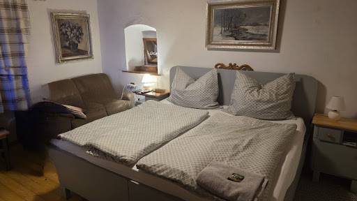 Das Familienzimmer für bis zu 5 Erwachsene Personen ist einfach, romantisch, sehr großräumig und lässt an ältere Zeiten erinnern. Das Haus ist verwinkelt und alles passend zueinander eingerichtet. Es ist viel Holz verarbeitet und der Fußboden knarzt schon sehr. Für uns nicht störend, eher passend zum Haus, aber evtl. für andere Gäste unangenehm. Wir haben nicht von anderen mitbekommen. Das Bad ist sauber und groß und nur für das Familienzimmer direkt nebenan. Ein direkter Zugang zur Küche ist am anderen Ende des Zimmers und wird mit anderen Gästen geteilt, aber man hatte einen eigenen sehr großen Kühlschrank. Die Betten waren weich, aber angenehm. WLAN war vorhanden und schnell genug. Wir haben gut geschlafen und im Winter stelle ich mir das hier sehr schön vor (Holzofen). Der Außenbereich kann ebenfalls umfassend genutzt werden. Absolut...