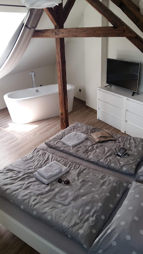 Pro: the price and the apartment is modern. The 2 women from the cafe downstairs were friendly and tried to help us as best they could. One of them went to her home for a hairdryer.||Con: wrongly reported in Booking.com. For this apartment on the top floor, you do not have your own kitchen etc, but a shared kitchen, bathroom and toilet. Very warm in the room, no air conditioning or fan. The owner will answer your questions by Booking.com, but everything in Czech. No English nor German. People had to register at the café on the ground floor and pay in cash in CZK, also not mentioned on Booking. Please note, you should not try to sleep before 11 pm... Regarding noise from the café, loud chatting...