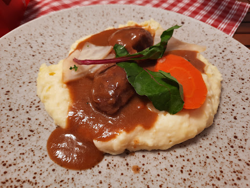 The restaurant is a dark gloomy room in style usually described as traditionally rustic, but in fact shows nothing but the lack of invention. In a cheap boring interior like this you cannot expect an extra quality, but even our short visit disgusted us. First invited us a smell of old, repeatedly burned oil (or fat?), the cheapest sort, what punched us over noses. That was the only invitation we got. After 15 minutes waiting at the table, without any sign of attention by staff, we asked the waiter to bring us the menu. The waiter brush us off saying he don't have time. This is the place where the guests bothers the staff. Its like a time machine what brings you back into the deepest period of real socialism. About the quality of food we have very little to say because we left...