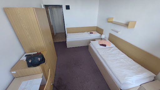 Read moreBohužel hotelové pokoje jsou ve stavu jako studentské koleje v 90.letech. Popraskané oloupané stropy, opravdu starý, plesnivý, zrezlý sprchový kout, a zatuchlý pach pokojů. Na pokojích je TV, balkon, stolek , šatní skříň se zásuvkami, dvě židle. Pokoj je fakt malinký, na přespání stačí. Jen se musí pořád větrat. Opravdu mě mrzí, že se více neinvestuje do rekonstrukcí, hotel je neustále plný, tento stav je neměnný po mnoho let. Na jedno patro jedna kuchyňka, konvice, mikrovlnka, lednice, stůl, židle, trocha nádobí. Mrzí mě to o to víc, že to je jinak super, pokud máme školicí akci, že projdeme suchou nohou na snídani i oběť a zpět do učebny. Snídaně jsou neměnné, 4 druhy pečiva, šunka,sýry, něco sladkého- nakrájená vánočka, nebo plněný štrúdl, míchaná vejce, párek, občas volske oko. Pak klasika máslo sýr, med, nutella, džem, jogurt v misce, křupinky... Neomezeně káva, cappuccino, čaje, limo. Oběd ale chutný, možnost objednání. Zatímco snídaně v ceně ubytování, oběd s polévkou a pitím cca 140-150 korun. Dá se předem navolit a objednat. Večeře jedině dole v hezkém kiosku. Přímo pod schody na NCONZO. Cena za obsazený dvoulůžkový pokoj na 4 noci se snídaní 2900. Takže v dnešní době na přespání ok. Cena super. Ale přeci jen......