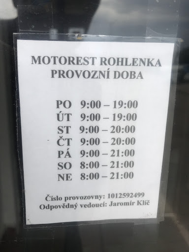 Read moreВ Рохленке мы всегда останавливаемся на ночлег, если едем мимо. Работает круглосуточно, места есть всегда, поесть можно всегда, всегда берут карты. Номера аскетичные (кровати, столик, стулья), санузел в номере (душ, туалет, жидкое мыло), в прихожей вешалки. При оплате выдают талон на завтрак на 60 крон. Free WiFi, бесплатная парковка во внутреннем дворике, заправка рядом, еда на любой вкус и кошелёк, есть Макдональдс, KFS, ресторан, столовая, бар. Рядом скоростная трасса на Австрию. Ну что еще надо для ночлега. Про шум трассы узнала из отзывов наших соотечественников, прокуренности не было ни разу, но если окна на внутренний двор, то пахнет дымом из пиццерии.||||Очень удивили отзывы в Букинге рАссиян и рядом живущих :0 Хотя, чем меньше таких "постояльцев" тем лучше.||Граждане! это Моторест, а не отель и даже не мотель. ||В моторестах отдыхают от дороги те, кто едет на автобусах, машинах и байках - тут ночуют, моются, перекусывают и едут дальше, они находятся на трассах и жаловаться на шум дороги, мягко говоря глупо. Талоны - очень удобны для групп туристов, чего тут непонятного, сумма есть, цены в столовой стоят, не хочешь доплачивать, не перебирай еды, считай! Цена в 17 евро за койку - это экономично!||В Белоруссии страшный совок с хамским персоналом продают за ту же сумму, да...
