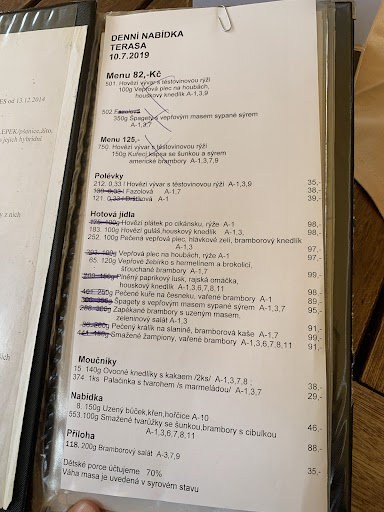 Read moreHotel i venkovní terasa vypadají pěkně, avšak v jiných ohledech první dojem pokulhává. Venku je vyvěšené denní menu i v době, kdy se dané jídlo již nevydává, v menu na terase jsou pravopisné a typografické chyby, jednotky jsou uvedené špatně, estetika hrůza... navíc je to ustřižené, jako kdyby to okousal pes. Jídelní lístek je už ušuntělý, ošahaný a s estetikou na podobné úrovni - určitě by to v této oblasti chtělo více snahy a péče. :( Co se týče jídla, polévka byla dobrá, silná a rychle přinesená, na mě i dostatečně teplá. Ale jelikož mně vyhovují chladnější polívky, umím si představit, že na někoho by již byla příliš chladná. Druhé jídlo bylo dobré, chutné, ale opět chladné - teď už i na mě... Maso trochu tuhé. Ceny průměrné. Obsluha ucházející. Nešlo platit kartou. Nedostali jsme žádnou účtenku. Toalety z letní terasy až na druhé straně domu. Navíc to kolem mísy bylo mokré a zaházené toaletním papírem... Jediná věc, která tuto restauraci zachraňuje od jedné hvězdy, je to, že to jídlo bylo...