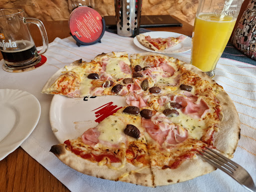 Sedáme si na terasu, jediné místo ve stínu jinak vše na parném slunci... Obsluha nám vysvětlila, že nás venku sežerou vosy, což jsem si říkal, že přežijeme a tak objednávku pití proběhla s přesvědčením, že zůstaneme , kde jsme... Po přečtení jídelního lístku, kde byla v 90% jen pizza , jsem si říkal, že to bude zas nějaká hrůza, ale co zkusíme.... Pizzu nám odmítla paní rozdělit tak, aby jsme na ní každý našli to svoje ,, tedy půlka pro malou a půlka pro nás " ale i tak objednáváme lež a příplatkem, tak nás nakonec pizza vychází na 250... Říkám si, že to už je cena luxusní pizzy a bůhví co dostaneme... 🤯
