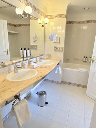 I stayed in a Superior Room on the top floor of the Riverside Wing, which featured a thoughtful layout with an entrance hall, guest restroom, wardrobe, a separate sitting area with flat-screen TV, minibar, and Nespresso machine, and a sleeping area with a king-size bed, writing desk, second TV, and access to a well-appointed bathroom. The tiled bathroom provided a separate bathtub and shower, double sinks, toilet, and Pupp-branded toiletries, all maintained by diligent housekeeping twice daily with fresh linens. The room’s two balconies opened onto enchanting views of Karlovy Vary - ornate architecture, the Teplá River, and forested hills created a serene, fairytale-like backdrop.