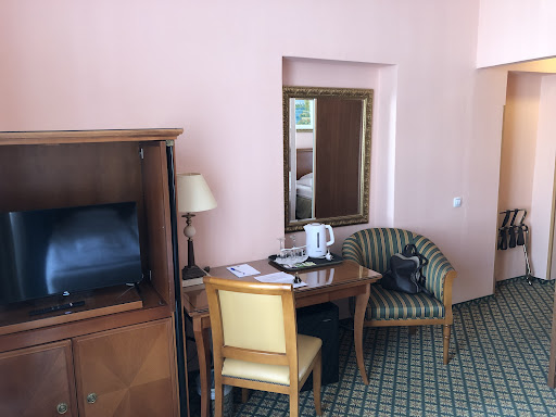 Read moreWe stayed 3 nights in family with a baby. No English speakers except for one hostess at our last day who was also friendly. |The 4 star indication in mislead me. It is certainly not a 4 star according to HOTREC, it's barely a 2 star. |About 20 stairs to reach reception from street - Avoid baby trolleys. |Interior look is rather old: old wall to wall carpet, furniture - broken garderobe barely closing, same for shower, and radiators may use some painting. We reserved QWEEN size bed but received 140cm bed since they don't have them in the hotel(!) as we were informed later. Bed springs too old to sleep 2 people in one bed. You will both sink. ||Breakfast: cottage/fresh/yellow cheeses, eggs/omelette, salads especially fish, so far good yet looks like lunch except of the presence of cereals, and some mini pain au chocolat depending on day. |Now bad part: no fruits - they finally showed up on our last day, no plain water (isn't this the spring water capital?), no coffee (only Nescafé) no charcuterie (soft kosher keepers are happy). Somebody will sit on your sit in the middle of your breakfast, without no warning....