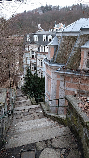 This pension is located in an attractive section of the upscale resort town of Karlovy Vary in the Czech Republic. It is in a mansion built in 1895. The building itself is handsome and the few rooms in it are well kept and spacious. However, getting to your room may prove something of a challenge because you first have to climb four successive flights of about 20 concrete steps each to reach the place. Then you find a place with no staff to help you lug up your bags to your room. [Our room was on the top floor, in a strangely configured attic]. The breakfast room downstairs is cheerful and serves a very basic meal with limited choices. The manager/desk attendant speaks neither English nor German. ||by Global...