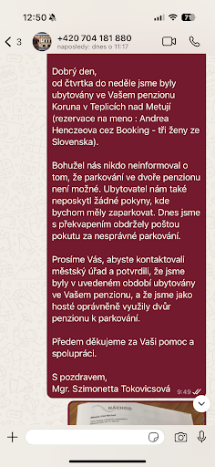 Problém však nastal, keď sme sa obrátili na majiteľa s jednoduchou oficiálnou požiadavkou: žiadali sme potvrdenie pre mestský úrad, že sme neparkovali na nesprávnom mieste, ale ako hostia penziónu. Pokuta totiž prišla z Nachova, v rovnakom čase, keď sme už boli ubytovaní v Teplice nad Metují. Takéto jednoduché potvrdenie je základným prejavom hosťovskej kultúry, najmä keď hosť nechá v ubytovaní stovky eur a očakáva aspoň minimálnu pomoc pri úradných záležitostiach.
