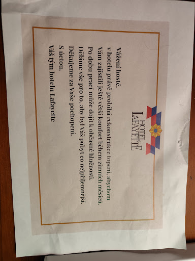 Read moreI discovered Lafayette for a fortunate case, just because my navigator mistook direction on my trip (from Italy to Belarus). Since that moment Lafayette and Olomouc became a fixed part of my frequent trips to Belarus. What to say? If a diamond is forever, Also Lafayette is. Cozy 4 stars hotel, close to a beautiful park and to the center of a special city. Everything is fine, just the check out isn't....but just because it's difficult to leave such a precious place and such a gentle and professional staff. I hope to come back there soon to introduce to them our new member of the family, after our pet Sofì (who enjoyed it a lot, probably top much...) i hope our son will do the same. Higly...