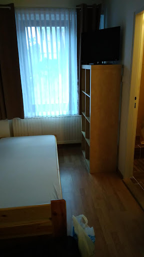 Ubytovanie má aj celkom výrazné negatíva, na chodbe je smrad, akoby tam niekto zomrel a nedá sa to vyvetrať, na teplú vodu v umývadle som sa nikdy nedočkala, na teplú vodu v sprche bolo treba čakať aspoň 10 minút, nehovoriac o zime na izbe, kvôli ktorej som ubytovanie opustila o dva dni skôr, samozrejme bez vrátenia peňazí. Na obranu pani majiteľky, priniesla mi druhé periny, ale na izbe nie ste celý čas pod perinou, takže "z dlhodobého" hľadiska to nepomohlo. Kuchyňa pozostáva z mini chladničky na chodbe, nad ktorou je mikrovlnná rúra s rýchlovarnou kanvicou, vedľa je skrinka s príborom a taniermi. Navyše v kuchyni chýba drez a riady je potrebné umývať na izbe v miniatúrnom umývadle a asi preto bolo vidieť, že "umyté" riady boli umyté dosť zle. V izbe chýbala druhá časť závesu, mala som tiež vylomené dvierka na skrini a polovica šuflíkov v komode bola pokrytá prachom. Posteľ mala veľmi tenký matrac a chrbticou som mohla spočítať všetky časti roštu. Okrem toho ide pravdepodobne o drevodom, kompletne všetko v dome aj z ulice bolo počuť. Lokalita je síce veľmi výhodná, no samotná oblasť je veľmi pofidérna, cestou z električky boli všade bezdomovci a robotníci, opustené staré budovy s rozbitými oknami a hostinec... ubytovaní hostia boli samí chlapi +40, ktorí chodili stále von fajčiť. Čerešničkou na torte boli už len tenké dvere, veľmi ľahko vylomiteľné dvere (aj na izbu, aj vchodové) a fakt, že vstupné dvere sa na noc nezamykali a bránka sa ani len nezatvárala..