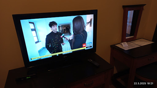 Hodně smutný pohled byl na zastaralou televizi se set top boxem a ještě od té televize chybělo dálkové ovládání, což jsem hned hlásil slečně na recepci, aby to nebylo na mě, že jsem ho odcizil.