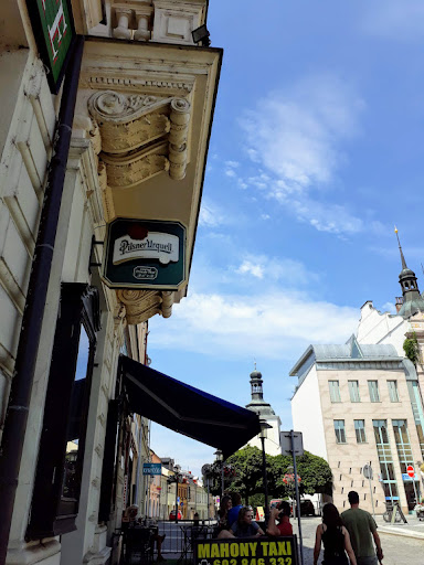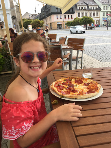 Restaurant Korunní princ: This restaurant offers a wide variety of food (czech/international). You can choose from a number of pizzas. The pizza Hawai was ok (much tasty and juicy than in some places in Prague) and vegetable salad with chicken was also ok. I have had better dishes in my life, but I would visit this place again I guess. The staff was pleasant and friendly. Surprisingly the waiter could speak German and helped one german lady asking for direction. The coffee was so so, but if you need coffein it is satisfying. The hotel has a terrace, but unfortunately it is close to the main road, full of cobblestones, thus you are disturbed...