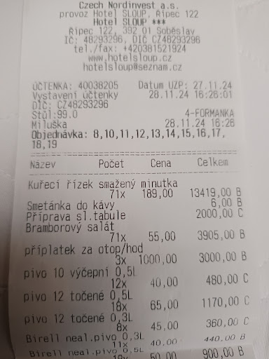 Read morePevně jsem veřil, že psát tuto recepti nebude potřeba. Ale vzhledem k velmi špatné komunikaci s panem Mádrem (majitelem?) to nejde jinak. V Hotelu Sloup jsme objednali smuteční hostinu na termín 28.11. Předem jsme provedli rezervaci prostoru a slučasně objednávku 70 stejných jídel. Poskytli jsme i jistotu toho, že pokud dorazí na hostinu méně než 70 hostů, uhradíme částku i za tato jídla. Cena nám předem nebyla sdělena. S tím nebyl problém. Předpokládali jsme to, že cena bude dle aktuální cenové nabídky jídelního lístku (150g Kuřecí řízek 115,- Kč, bez přílohy). Po hostině jsme dostali účet, který jsme na místě v hotovosti uhradili. Až následující den jsme se pozastavili nad dokladem. Na účtence bylo uvedeno 71 “minutek” (cena za jednu porci 189,- Kč, bez přílohy). Minutek, tedy jídel, která se připravují v momentě konkrétní objednávky, nikoli dopředu. Jídla jsme objednávali 5 dní dopředu, rozhodně tedy ne v moment, kdy jsme usedli ke stolům. Jídla nám byla podávána okamžitě. Vzhledem k počtu porcí rozumíme tomu, že některé porce byly vlažnější. To že gramáž některých kousků byla odlišná už od oka, to také neřešíme. Co ale řešíme je právě přístup pana majitele. Kontaktovali jsme ho po telefonu, situaci nerozumněl a nabídl nám osobní setkání, danou situaci chtěl řešit. V domluvený den a čas jsem se mu měl ozvat telefonicky. Telefon už ovšem nezvedal. Ani několik dní poté nereagoval, neozval se. Na zprávy také nereagoval. Poslední co nás opravdu nepříjemně zarazilo bylo to, udělat něco takového právě na smuteční hostině. Co bychom chtěli na závěr opravdu vypíchnout byla obsluha. Obsluha se o nás starala perfektně a v tomto ohledu nemáme...