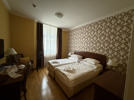 Wow, we got this special apartment with the little tower-like medieval structure that overlooks the square. I love it so much! The room is incredibly handsome, spacious and luxurious, the rugs and curtains thick, the furniture functional and pretty. We got a little kettle and tea supplies at our disposal in the room, a mini bar, robes and slippers, several pillows of different sizes, a nice bath tub, brand-name soap and shampoo... The bed is very big and comfortable, might be a bit too high for some people (I'm glad I thought of bringing a number of little mattresses to pad its surroundings should our young son fall off it), the sofa bed is sturdy and comfortable, too. There is a little (or not so little) living room in the huge hallway just outside our room that could be very useful should we stay longer in this hotel next time. It has a spa with a whirlpool, two types of sauna and a relaxing area. Water was served without request, a thoughtful gesture as it gets really warm there. Be sure to book the spa in advance. They reserve it just for you and your family, a maximum of 5 people. It's worth mentioning, though, that they do not serve food apart from breakfast (but did get us a glass of warm milk when requested). The breakfast wasn't anything special (nor was the coffee), but it did not lessen my overall experience. I am sure to recommend this place and I am looking forward to...