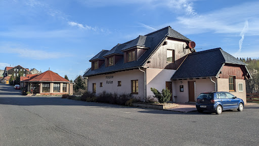 A splendid, isolated, almost "alpine" location in north Bohemia. Maybe quicker to reach from Germany which is only 50 yards away, but we got there by train (one hour) from Prague to Teplice and then a local bus (45 mns) to Moldava - a lovely journey. The Pension is chalet style, simple but comfortable and pleasant. Room good (small TV, cooking facilities downstairs), bathroom very satisfactory and downstairs a well appointed communal sitting area (sofa, large TV etc) and kitchen (fridge cooker etc) for the half dozen or so, rooms. Liberal re-cycling of old Singer Sewing machine treadles! Simple breakfast in next door building. Further along, the restaurant with most helpful and pleasant staff and good local fare. Small community, slightly run down with an interesting history - including a yet to be restored old railway station. Much taken by it. great for the curious, cyclist...