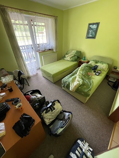 Obiekt zlokalizowany na przedmieściach, na terenie stadniny koni, oddalony od drogi głównej. Wokoło cisza i spokój. Pokoje zlokalizowane na piętrze pensjonatu wraz z dużymi balkonami. Wyposażenie samego pokoju typowo turystyczne + ręczniki + TV. Dostęp do wspólnej chłodziarki na korytarzu - przed pokojami. Na parterze obiektu bar \ restauracja czynna do późnego wieczora, z możliwością zamówienia posiłków. Około 1 km. do centrum miasteczka ( Rynek ). Na miejscu parking prywatny, bezpośrednio przed oknami pensjonatu. Niestety parking nie zamykany i bez zadaszenia. Wygospodarowane po rozmowach miejsce ( w pomieszczeniach stajni ) na zaparkowanie naszego motocykla w celu ochrony przed opadami. Przed przybyciem zainteresowanie właściciela godziną przybycia w celu przekazania kluczy. Właścicielka bardzo miła, uczynna i sympatyczna. Płatność za usługi hotelowe gotówką przy zakwaterowaniu. Przebywaliśmy w pensjonacie tylko 1 dobę - w trasie motocyklowej w kierunku Niemiec. Drobne mankamenty To : Brak lodówki lub chłodziarki w pokoju. Brak klimatyzacji w pokoju. Brak w pokoju elementów podstawowych do przygotowania prostego posiłku ( talerzyk, sztućce, szklanka, ... ) Ale dzięki uprzejmości właścicielki wypożyczono nam w/w elementy do przygotowania śniadania w pokoju !!!