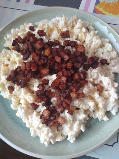 Halušky byly rozvařené, připomínaly spíš bramborovou kaši než poctivé slovenské jídlo. Slanina? Spálená, zatuchlá, připravovaná nejspíš ve fritéze, což haluškám vůbec nesvědčí.