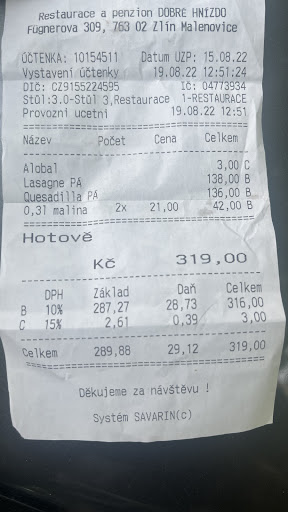 Read morePřišli jsme do restaurace v pátek cca v 13.00. Obsluha si nás všimla asi až po 10-15 minutách, ačkoliv obsluhy bylo dost a hostů málo. V menu už byla 3 z 6 jídel přeškrtnuta. Když už obsluha přišla, dozvěděli jsme se, že další dve z těch jídel už nejsou a že už vlastně je pouze kuřecí řízek s bramborovým salátem, který v lístku absolutně není. Dále nám bylo řečeno, že cesnekovo-syrova polévka už není a je tomatová nebo vývar. Tak jsme si objednali 1 tomatovou a jeden vývar. Po chvíli nám ale servírka přinesla dvě česnečky, aniž by nás někdo o změně polévky informovala. Řízek se salátem byly dobré, ale uvítal bych např. citrón. Celou dobu hrála nahlas příšerná hudba, která se hodí na diskotéku, ale ne do restauračního zařízení. Dále bych chtěl upozornit servírky, že je velmi nevkusné, když mezi sebou nahlas pomlouvají kolegyni (nebo koho to pomlouvali) a baví se o penězích. Hosty tohle u jídla rozhodně nezajímá. Nevím, jestli nastaly poslední dobou nějaké personální změny, ale zdejší hodnocení absolutně neodpovídá tomu, co jsme...
