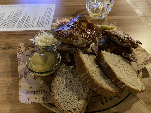 There is a bar with a small selection of good beers and decent wines. Good espresso. One can order food which is not bad but not great either....