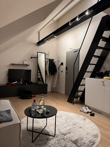 The apartment layout is weird: you enter into a corridor, then a small living space with a kitchen, and go down a staircase to find the bedroom and bathroom. Half of the bed is literally under the stairs, which is already uncomfortable. Worse, the downstairs area has no proper ventilation and a constant musty, damp smell — especially noticeable under the stairs, near the bed.