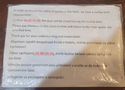 The owner of the hotel, who appeared to be heavily intoxicated, was circling around us throughout the situation. The Chinese staff — who spoke no English or Czech — were unable to communicate with us or the police at all. The owner was visibly unstable on his feet, argued with the police, and was extremely rude. Shockingly, just before we were about to leave, he suddenly started speaking to us in German (we‘re Germans) — despite having clearly heard us speaking German the entire time.