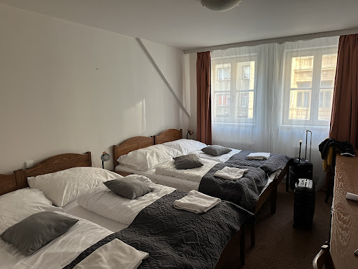 The rooms are finely furnished, with an antique accent in their otherwise laconic design. They provided a super-nice baby cot for free in our standard double room. Reception works 24h and always ready for help. All receptionists speak good English as well as some of them do Russian, and, of course, Czech. They provide a buffet breakfast in a restaurant downstairs included for all people staying in the room. Meal is quite basic: bacon and eggs, cereal, cheese, yoghurt, fruits and vegetables, — though is really tasty and always present during morning time, a very good basis for a whole day walking. Free WiFi in the rooms is stable and high speed.
