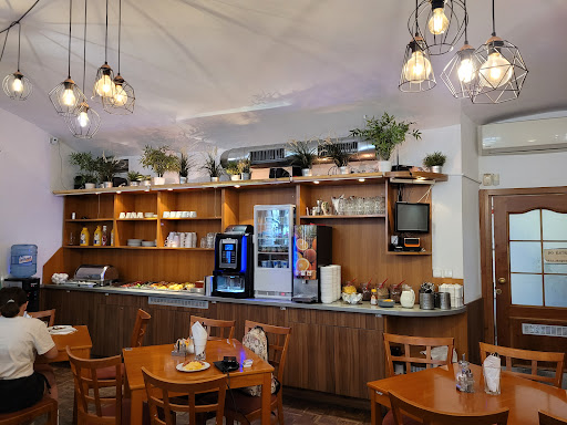 Das Frühstück war jedoch unterirdisch. Der Kaffee (Automat) war so übel, dass wir auf das kleinste Übel, den Automatenkakao, umgestiegen sind. Die Kuchen waren billigste Supermarkt Fertigkuchen. Die Servicekraft sprach keinerlei Fremdsprachen und Freundlichkeit war auch ein Fremdwort. Trotz versuchter Reklamation und Nachfrage, vielmehr eine flehende Bitte, um Filterkaffee wurden wir nur grimmig angeschaut, bevor die gute Frau wieder in der Küche verschwand. Lieber Hotelbetreiber, Kaffee zum Frühstück ist kein Hexenwerk, aber die gefärbte Brühe bei Ihnen war so schlecht, dann bieten Sie doch bitte erst gar kein Frühstück an, bevor Sie noch deswegen verklagt werden. Das sahen scheinbar auch die Hotelbediensteten so, die selber im Personal Nebenzimmer bei der Rezeption auf eine Filterkaffeemaschine zurück greifen. Unabhängig davon war es sehr eng und zu wenig Platz im Keller gelegenen Frühstücksraum. Trotz zu wenig Sitzplätze, die auch noch sehr eng beisammen gestellt waren, wurde das schmutzige Geschirr der vorherigen Gäste trotz Warteschlange neuer Frühstückswilligen, erstmal lange Zeit nicht vom Tisch geräumt. Am hinteren Fenster standen direkt die Mülltonnen, so dass andere Gäste erstmal die Fenster schließen mussten, um vom Müllgestank der Straße die Nahrungsaufnahme wagen zu können.