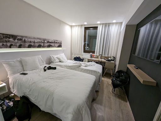 First of all, we booked at Occidental Praha Five but after arriving there they said there was a technical error on the junior suite floor and therefore they had to move us to this Occidental hotel. This one is really out of the way compared to Praha Five, so it was a little disappointing. The reception said we got an upgrade to a Junior Suite, but we already booked a junior suite. Then we got to the room, finding a double bed instead of the twin room we requested. After going to reception about this issue, they had to downgrade us to an Executive room on the highest floor. We only accepted it because of the low price. We could have been in a junior suite in Praha Five, but now we were in a downgraded room on a much worse location. They did nothing to compensate the downgrade, no free drink or anything. Though, the staff at reception was pretty friendly.