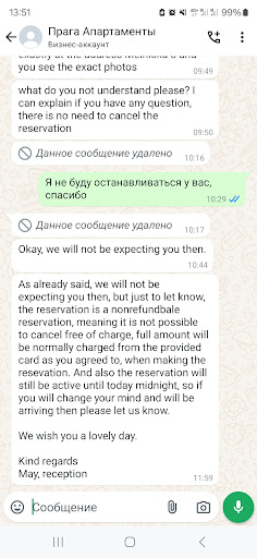Read moreЭто худшая прокатная компания, которую я когда-либо видел в своей жизни. Они просто мошенники. Поудаляли часть нашей переписки🙈 Я пыталась забронировать квартиру вчера, нужно было сразу же дать данные своей карты. Я получила подтверждение бронирования, но на фотографии была совсем не моя квартира. И только после регистрации мне сказали, что я должна внести предоплату в размере 200 евро. Вчера и сегодня я переписывался с ними полдня, но они не предоставили мне реальных фотографий под разными предлогами. Вчера они не предоставили как распределяются комнаты клиентов у них один день в день и они не знают кто в какой комнате будет жить 🙈 Бред. Я вам сегодня перезвоню. Я снова переписывалась с ними. Но вместо ответов они говорили только о необходимости моей оплаты, в том числе и предоплаты. Потом сами предложили отменить регистрацию. После нашей переписки я решила отказаться. Они еще раз уточнили у меня про отмену, буду ли я это делать или нет. Я подтвердила. Деньги с моего капта на тот момент не были сняты. Я уже нашел и купил другие квартиры. Через 2 часа мне снова написали, приедете вы или нет, мы спишем деньги с вашей карты, которую я указал. И, конечно, деньги были списаны.....